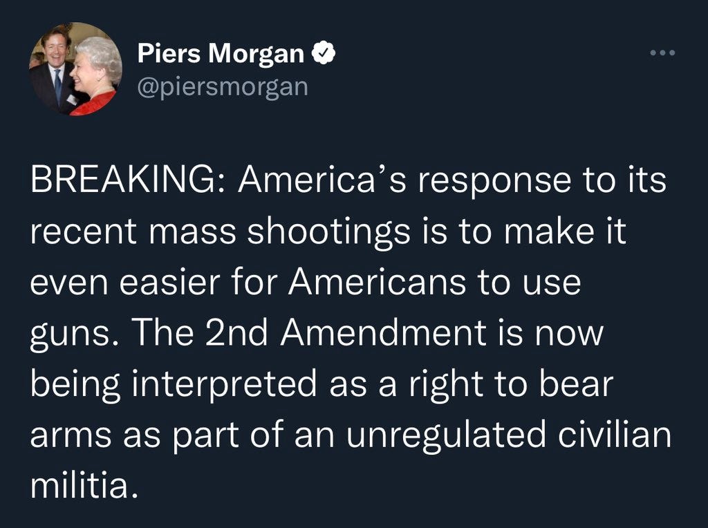 Piers Morgan seorang jurnalis yang pernah menduduki posisi sebagai juri dalam show America Got Talent. Terjemahan: “Berita Hangat: Respon dari Amerika atas kejadian penembakan massal baru-baru ini malah membuat orang Amerika lebih mudah menggunakan senjata. Amendemen ke-2 sekarang diartikan sebagai hak untuk bersenjata sebagai bagian dari milisi sipil yang tidak teratur.”