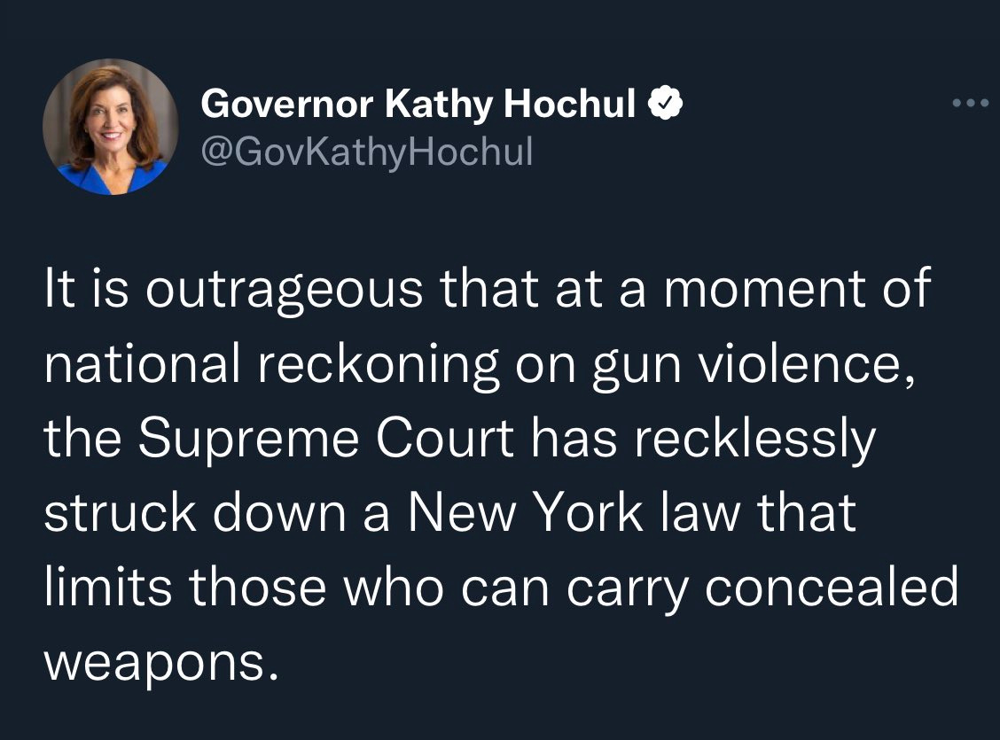 Tidak heran gubernur dari kelompok demokrat Kathy Hochul juga ikut-ikutan bernyanyi, “Sangat keterlaluan saat negara sedang berusaha pulih dari kekerasan senjata, Mahkamah Agung secara gegabah membatalkan hukum negara bagian New York yang [sangat] membatasi siapa yang diperbolehkan membawa senjata.”