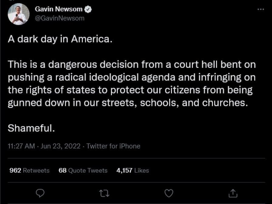 Terjemahan: Suatu hari gelap di Amerika. Keputusan bahaya yang dikeluarkan Mahkamah tunduk kepada tekanan ideologi radikal dan melanggar hak negara bagian untuk melindungi masyarakatnya dari penembakan di jalanan, di sekolah, dan di gereja. Memalukan.”