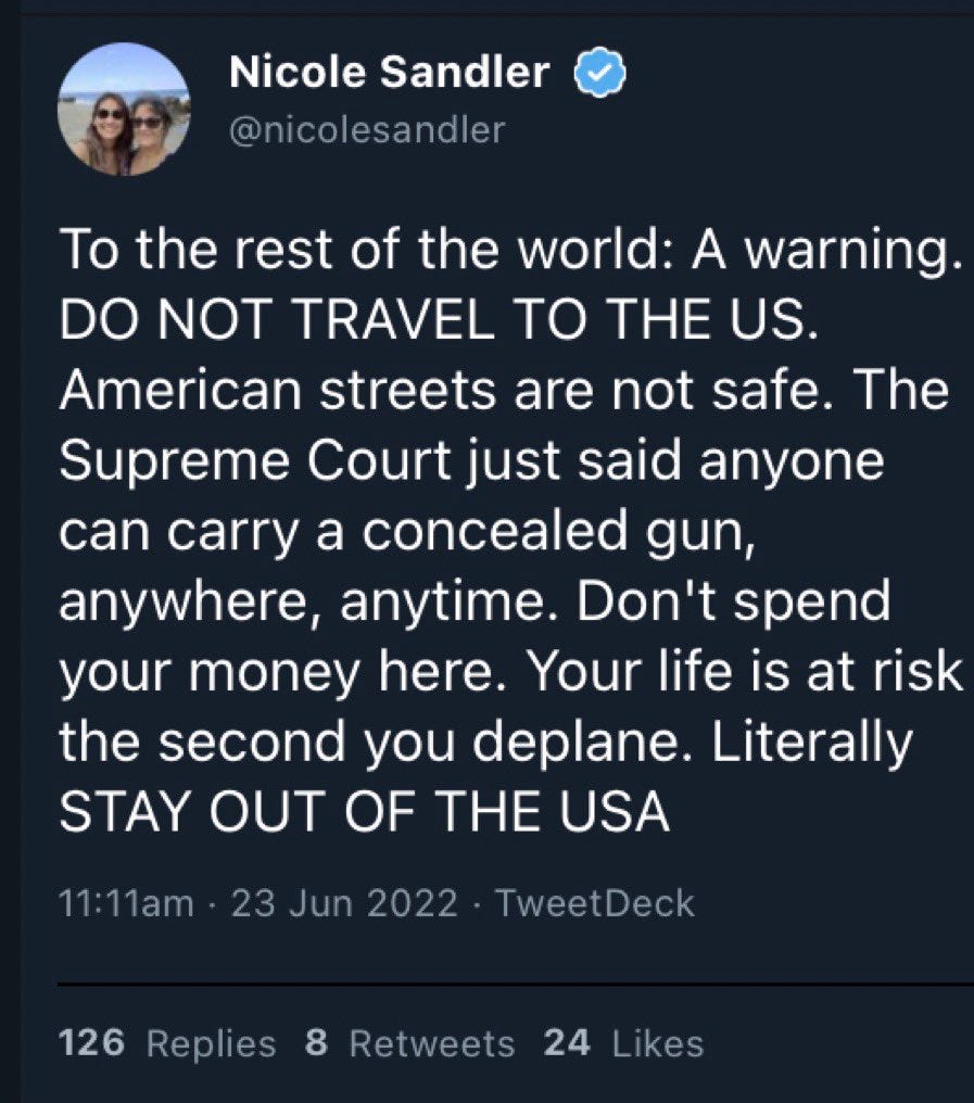 Nicole Sandler, pembawa acara radio berkata, “Perhatian seluruh dunia: Sebuah peringatan. JANGAN BEPERGIAN KE AMERIKA. Jalan-jalan di Amerika tidak aman. Mahkamah Agung baru saja menyatakan bahwa siapa saja bisa membawa senjata, dimana saja, setiap saat. Jangan membelanjakan uang anda disini. Nyawa anda dalam bahaya saat anda keluar dari pesawat terbang. Sesungguhnya JAUHI AMERIKA.”