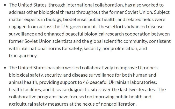 Amerika Serikat juga telah bekerja secara kolaboratif untuk meningkatkan keamanan biologis Ukraina, dan pengawasan penyakit untuk kesehatan manusia dan hewan, memberikan dukungan kepada 46 laboratorium Ukraina yang damai, fasilitas kesehatan, dan situs diagnostik penyakit selama dua dekade terakhir. Program kolaboratif telah difokuskan pada peningkatan kesehatan masyarakat dan langkah-langkah keamanan pertanian di nexus nonproliferasi.