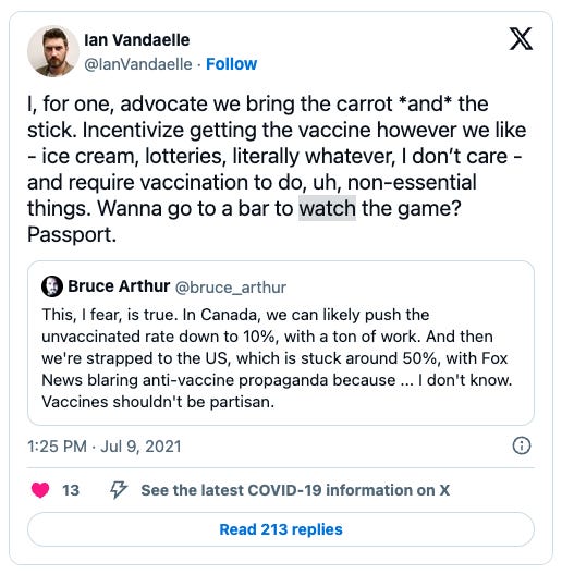 “Saya, misalnya, menganjurkan agar kita membawa wortel dan tongkat. Berikan insentif untuk mendapatkan vaksin sesuka kita – es krim, lotere, apa pun itu, saya tidak peduli – dan mewajibkan vaksinasi untuk melakukan hal-hal yang tidak penting.