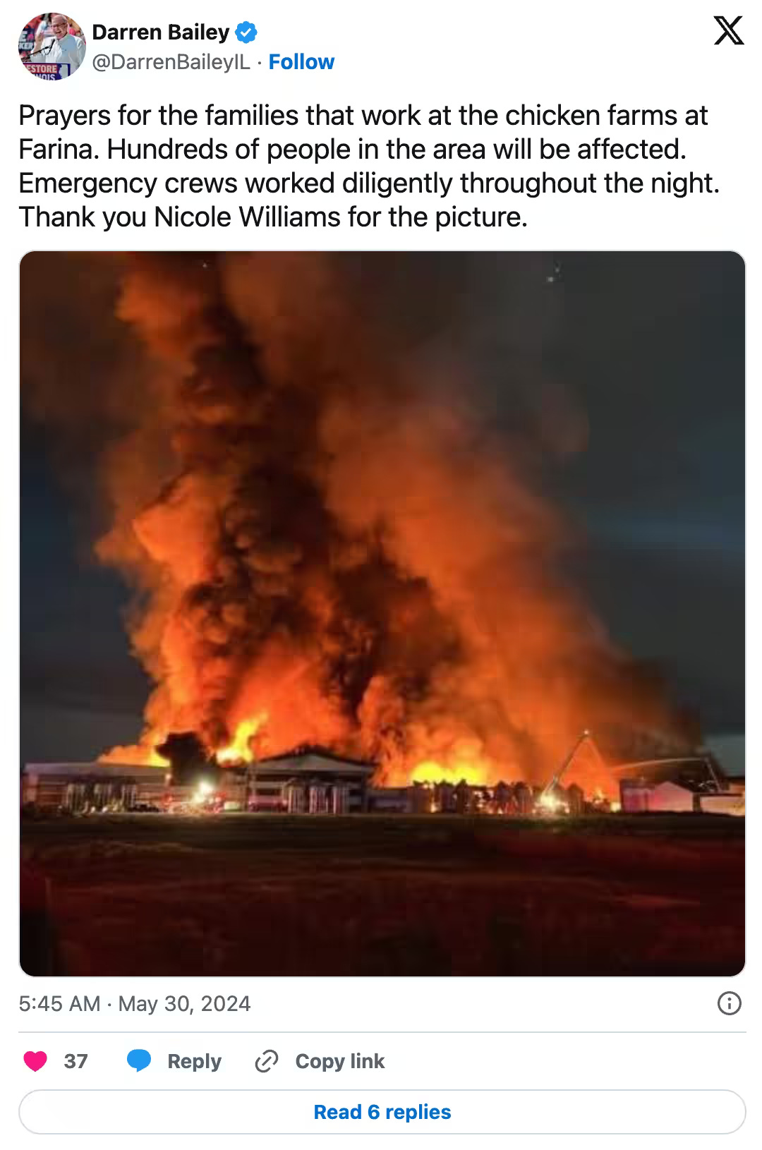 “Kami memantau perkembangan mengenai kebakaran dahsyat yang terjadi tadi malam di Farina Farms di Marion County, tepat di seberang garis distrik kami. Berkat tindakan cepat dan berani dari petugas pertolongan pertama, tampaknya tidak ada korban luka,” kata Rep. Mike Bost (R-IL).