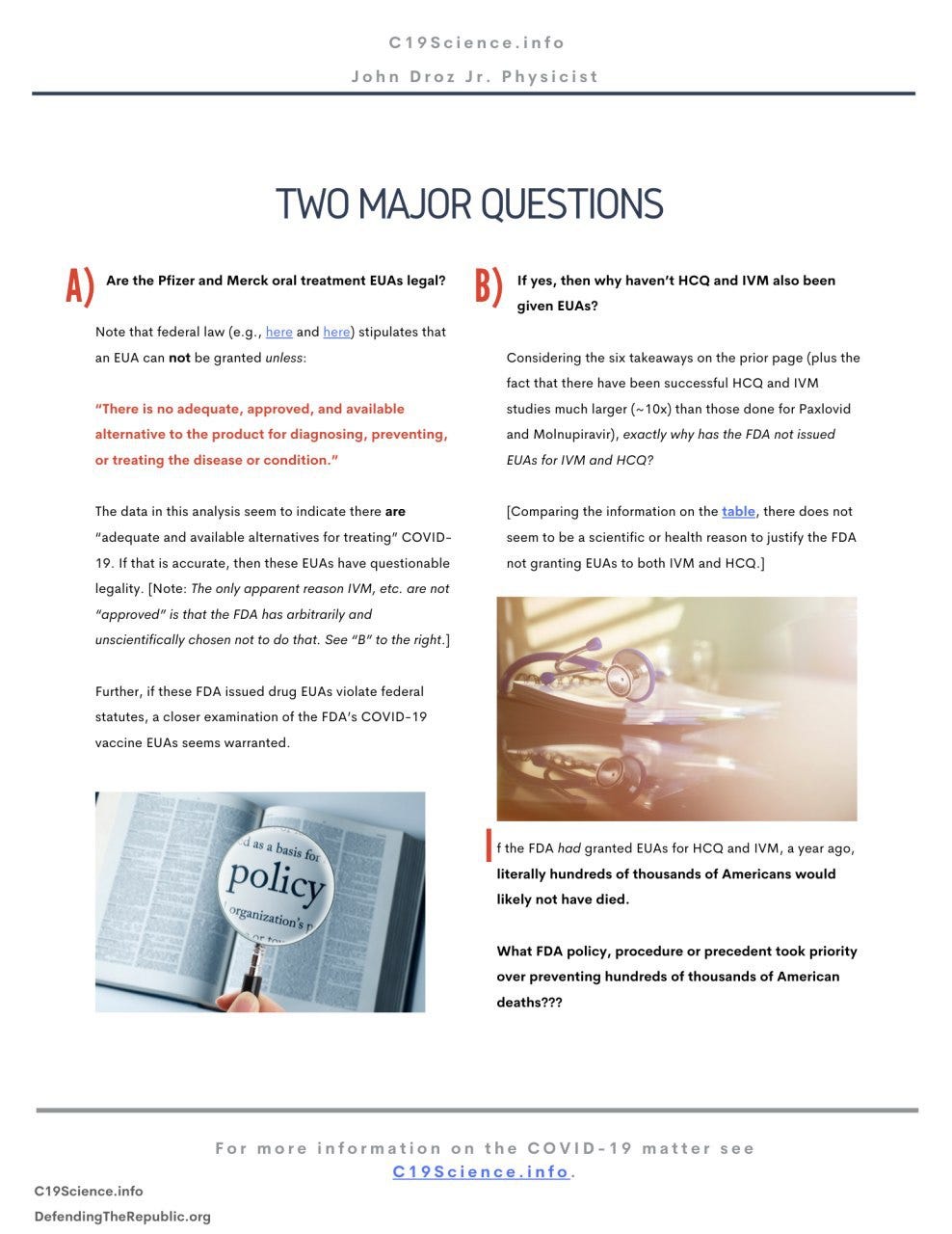 Data yang terdapat pada analisa ini terlihat memberikan indikasi ada “pilihan pengobatan alternatif dan memadai untuk perawatan” Covid-19. Kalau keadaan itu ternyata akurat, maka Otorisasi Penggunaan Darurat [yang digunakan Pfizer dan Merck] bisa dipertanyakan keabsahannya. [Catatan: Alasan-alasan yang jelas bahwa IVM, dsb tidak memperoleh “persetujuan” karena FDA berpihak dan tidak mengacu kepada ilmu pengetahuan dalam memberikan persetujuan. Baca poin “B” di bawah ini]