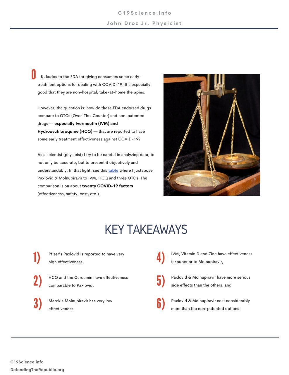 Akan tetapi, pertanyaannya adalah: bagaimana obat-obatan yang diusulkan FDA dibandingkan dengan obat-obatan yanng tersedia bebas dan generik -khususnya Ivermectin (IVM dan Hydroxychloroquine (HCQ) - yang juga dilaporkan keampuhannya untuk pengobatan dini bagi Covid-19?