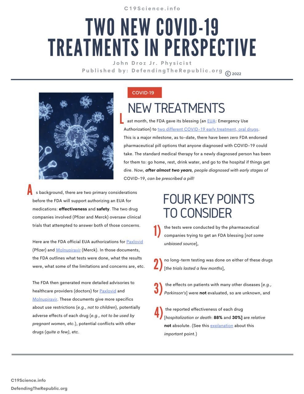 Bulan lalu, FDA (Food and Drug Administration—Pengawasan Obat dan Makanan) merestui (Otorisasi Penggunaan Darurat) atas dua perawatan dini atas Covid-19, obat-obatan yang diterima melalui mulut. Ini merupakan satu langkah besar, per hari ini, tidak ditemukan pil farmasi yang diusulkan oleh FDA bagi mereka yang didiagnosa Covid-19 untuk pengobatan. Terapi standar medis untuk mereka yang baru didiagnosa hanya: berdiam di rumah, minum air dan memeriksa ke rumah sakit bila kondisi memburuk. Sekarang, setelah hampir 2 tahun, mereka yang didiagnosa dengan gejala dini Covid-19, bisa memperoleh resep pil pengobatan.