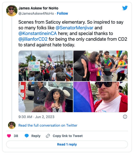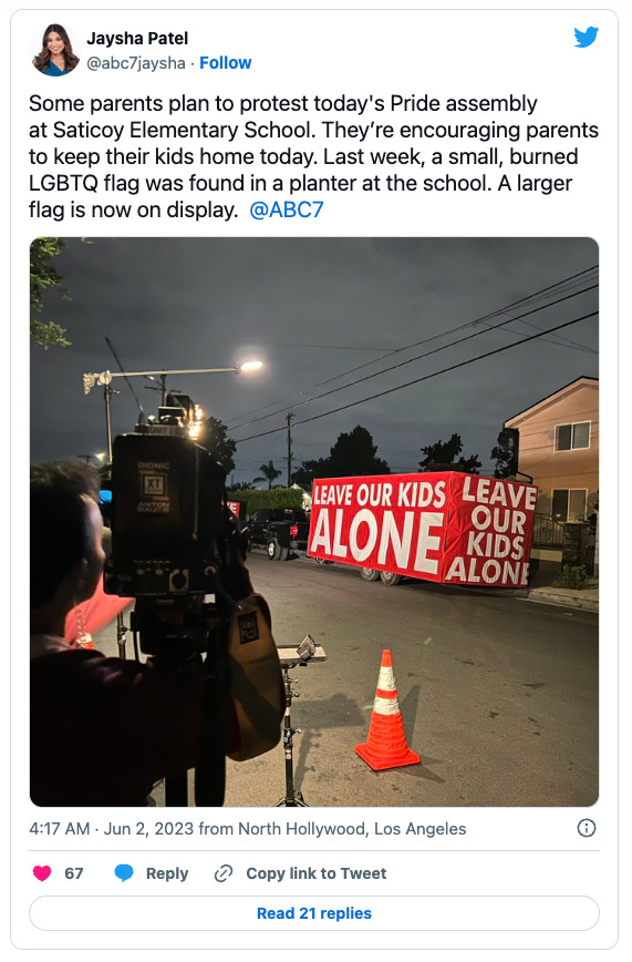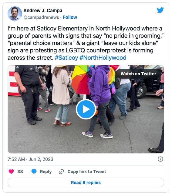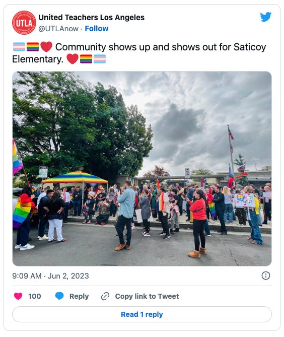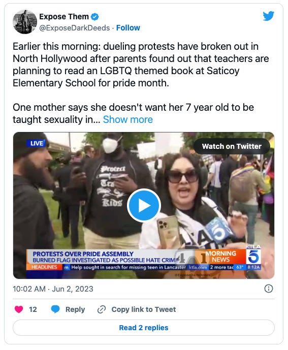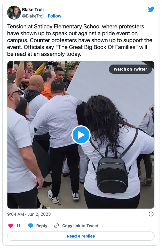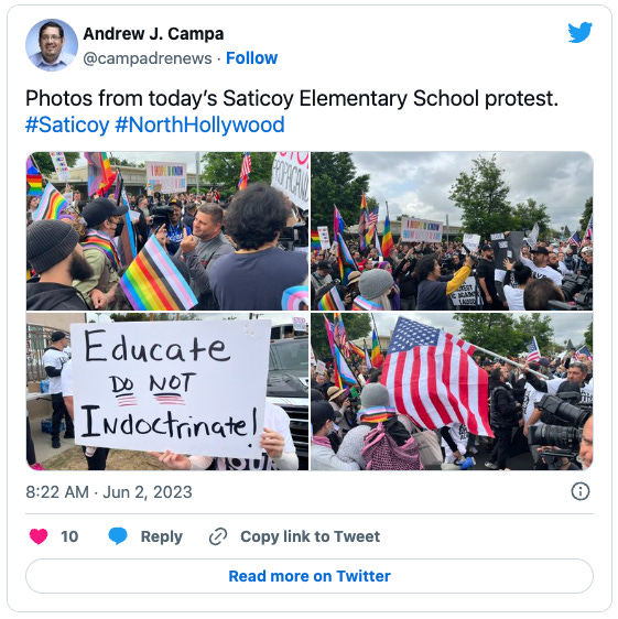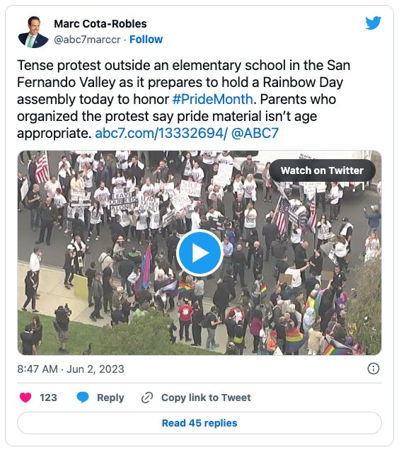 Diterjemahkan secara bebas dari Parents Protest Elementary School “Pride” Assembly for Children in North Hollywood, California (Video), Kristinn Taylor, 2 June 2023.