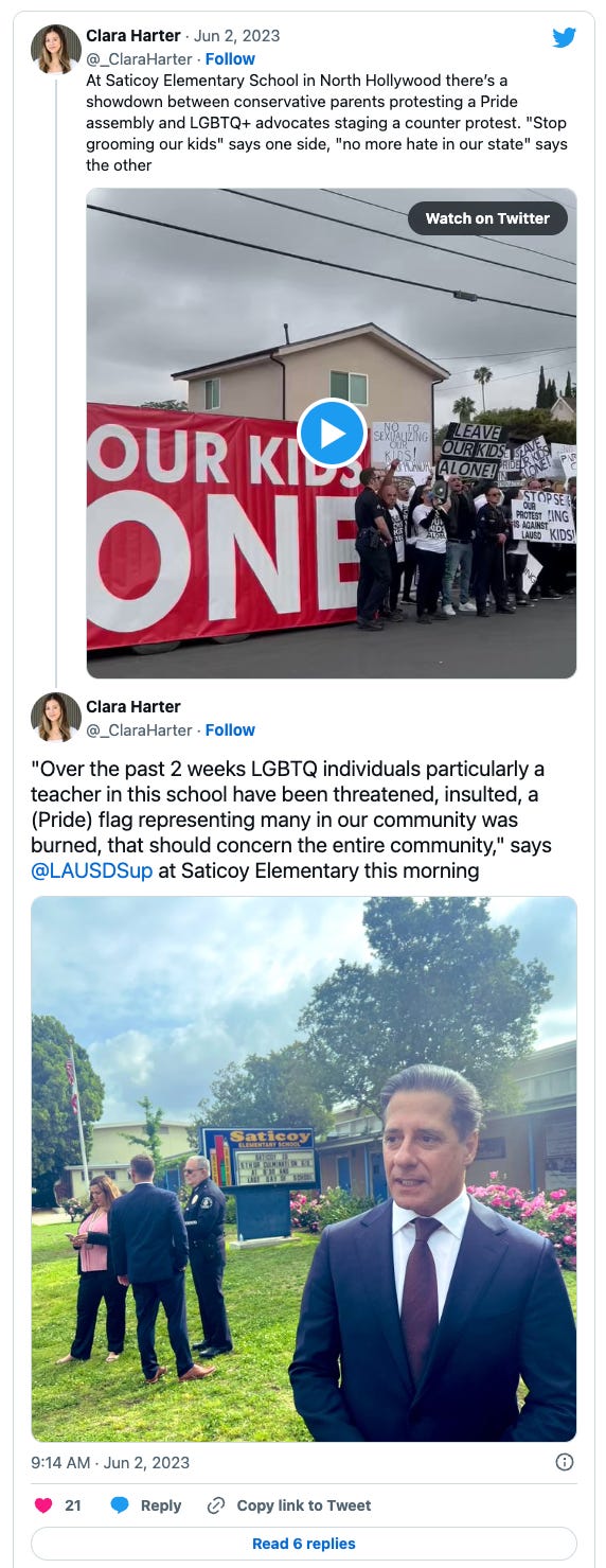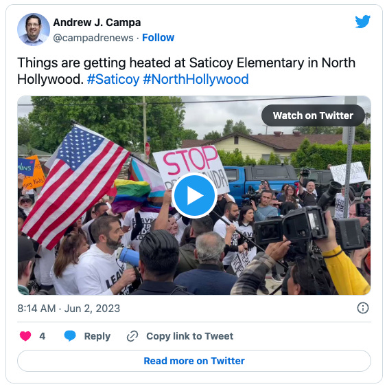Pengawas Sekolah Los Angeles Alberto Carvalho ada di sekolah, "" Selama 2 minggu terakhir individu LGBTQ terutama seorang guru di sekolah ini telah diancam, dihina, bendera (Kebanggaan) yang mewakili banyak orang di komunitas kami dibakar, yang seharusnya menjadi perhatian seluruh komunitas,” kata @LAUSDSup di Saticoy Elementary pagi ini.”